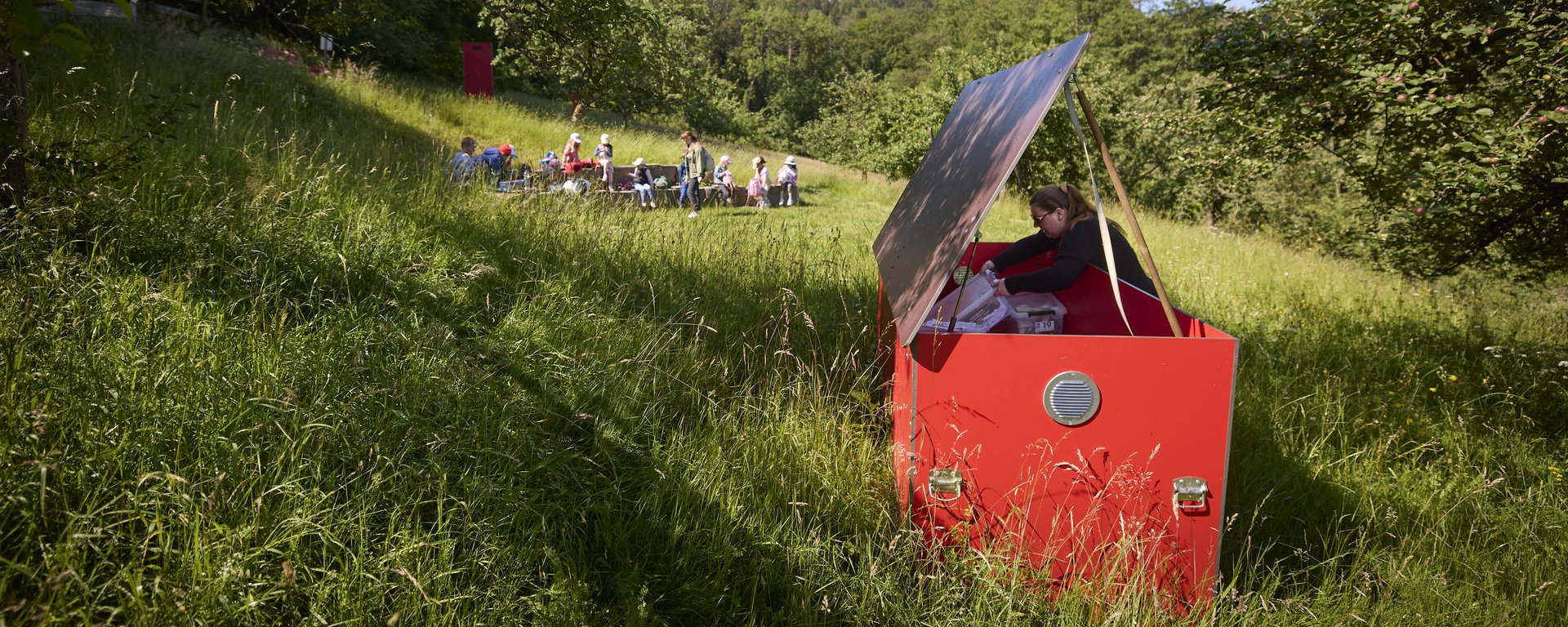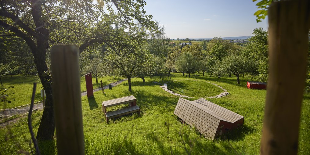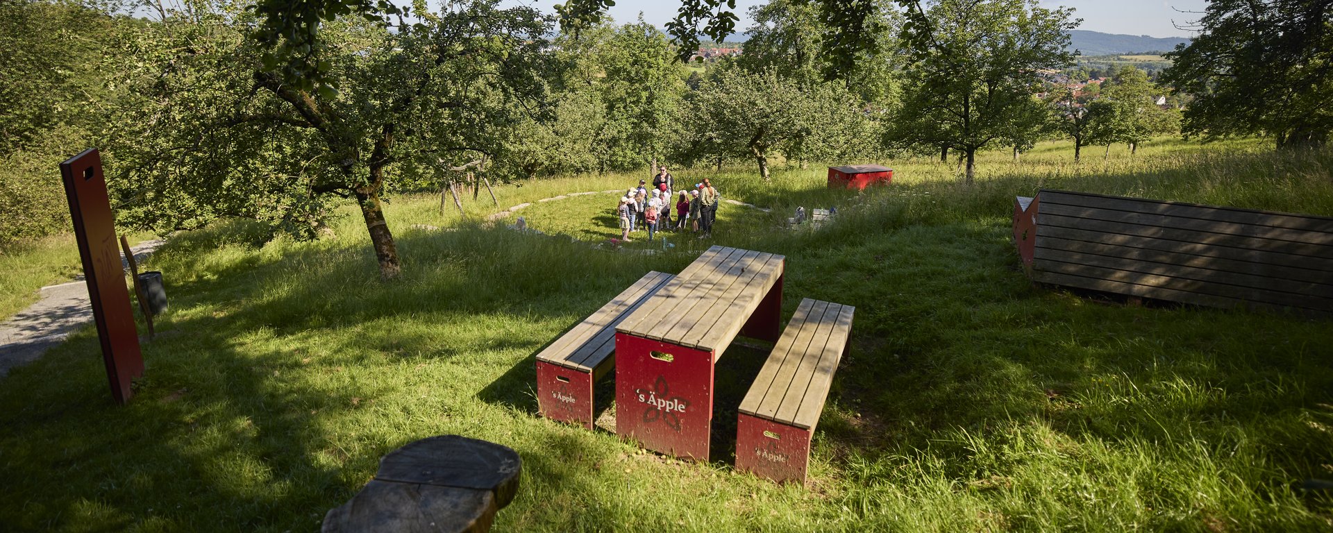 Das Grüne Klassenzimmer ergänzt den Erlebnisweg s’Äpple und macht die Bedeutung der Streuobstwiesen als Lebensraum, Kulturlandschaft und Erholungsraum mit allen Sinnen erlebbar.