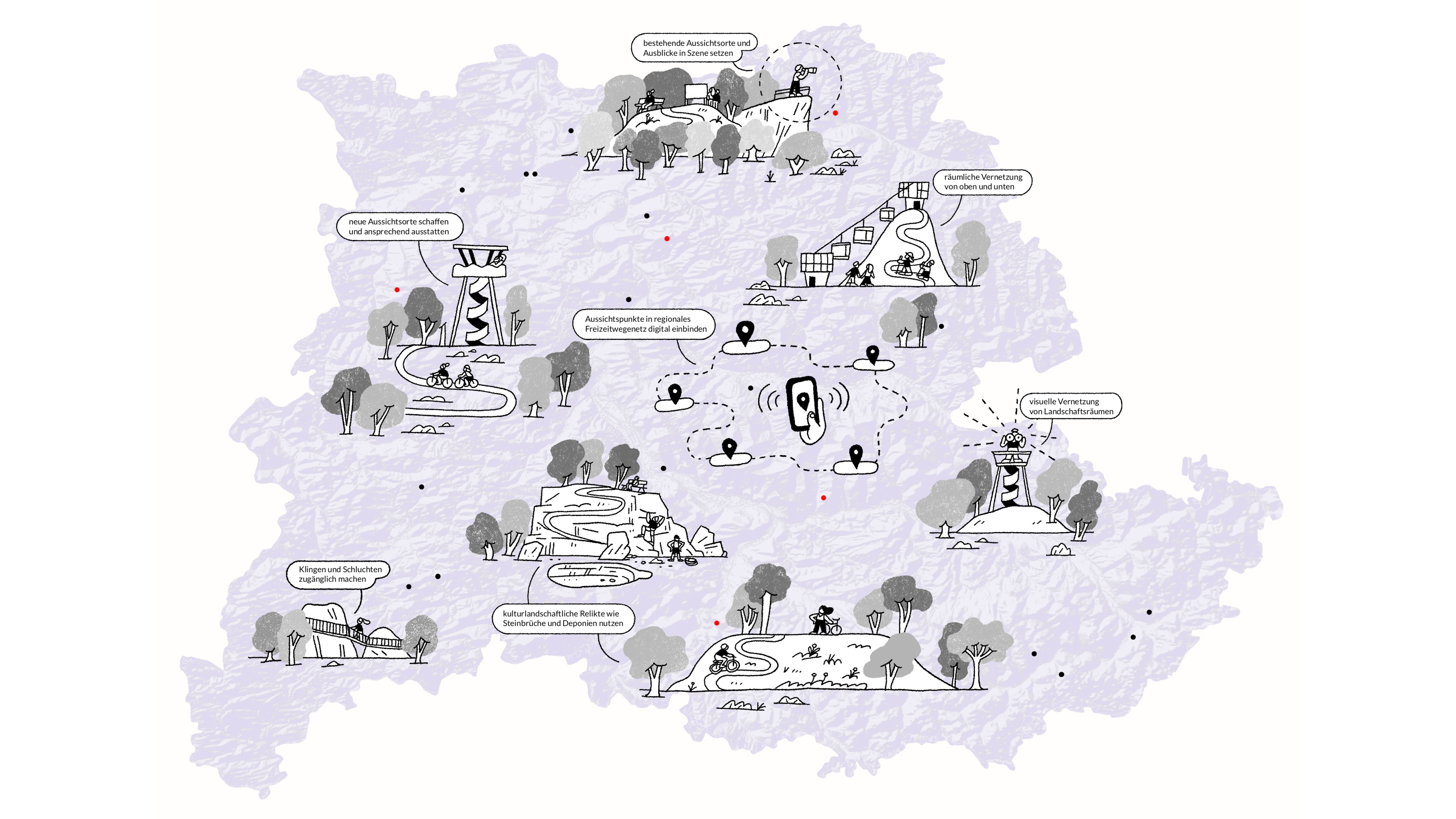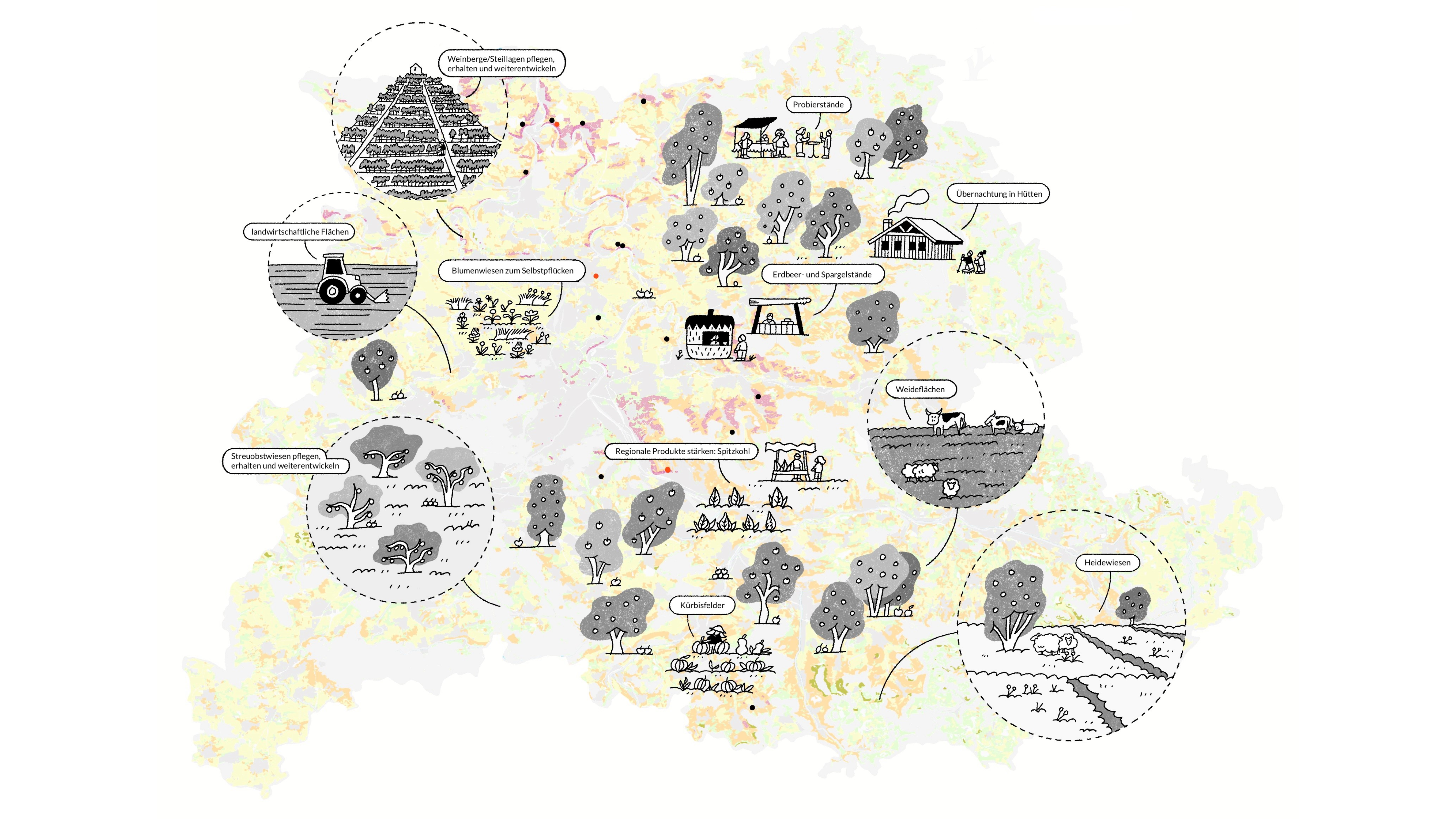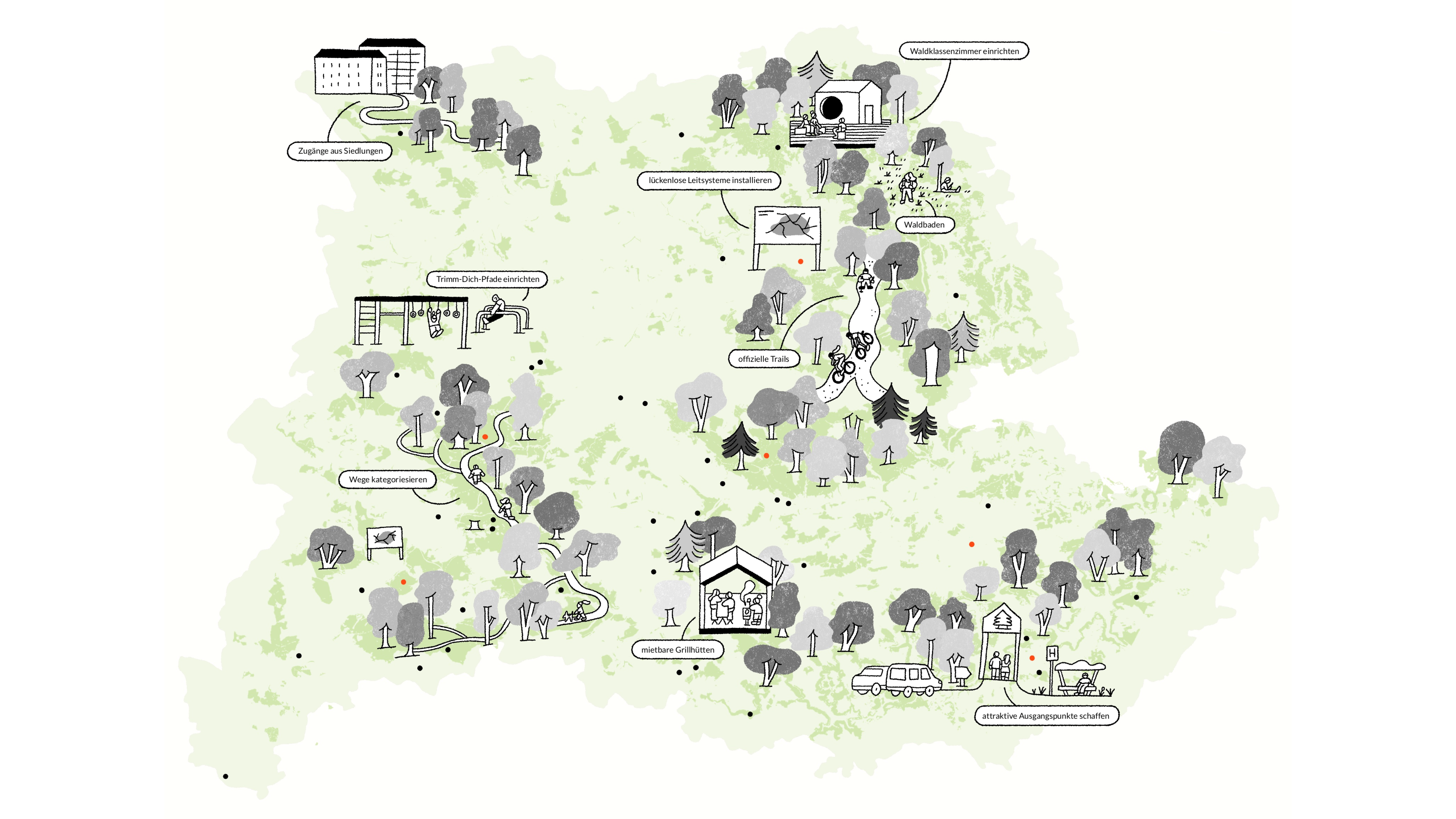 In einem umfangreichen Verfahren unter Beteiligung der Öffentlichkeit wurden acht zentrale Handlungsfelder erarbeitet. Sie spiegeln die gesellschaftlichen Bedarfe und Interessen wider, nehmen Bezug zu lokalen und regionalen naturräumlichen und landschaftlichen Besonderheiten und bilden den Rahmen für die zukünftige Entwicklung der Naherholung und Landschaft.