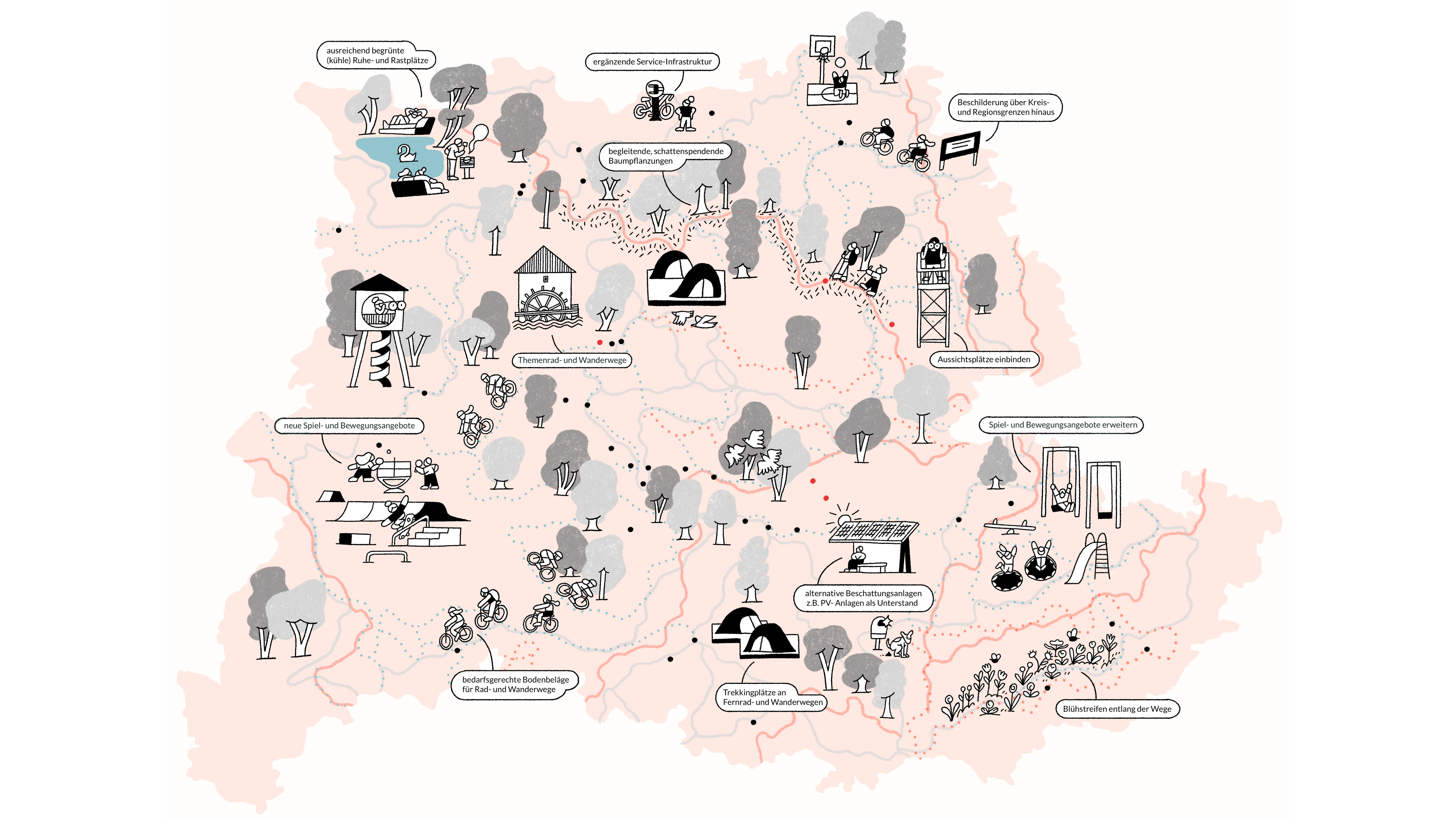 In Verbindung mit zahlreichen Flüssen und Stillgewässern sowie der räumlichen Nähe von Landschaft und Siedlung verfügt die Region über hervorragende Voraussetzungen für naturraumgebundene Freizeit und Erholung. Dies trägt dazu bei, dass Natur und Landschaft von der Bevölkerung in besonderem Maße geschätzt werden. Neben einem engmaschigen Freizeitwegenetz bietet die Region spezifische naturgebundene Sport- und Spielangebote wie MTB-Trails und Kletterrouten, aber auch wasserbezogene Erlebnisse an den elf Badeseen. Diese Qualitäten zu erhalten und auszubauen, ist ein klarer Auftrag an die Kommunen und die Region.