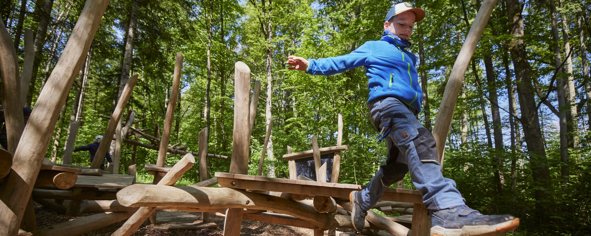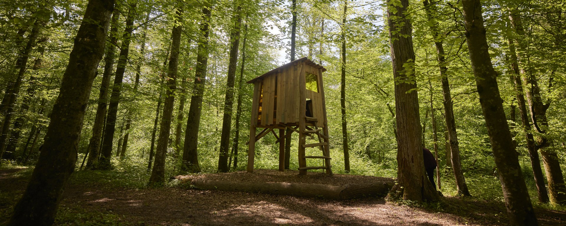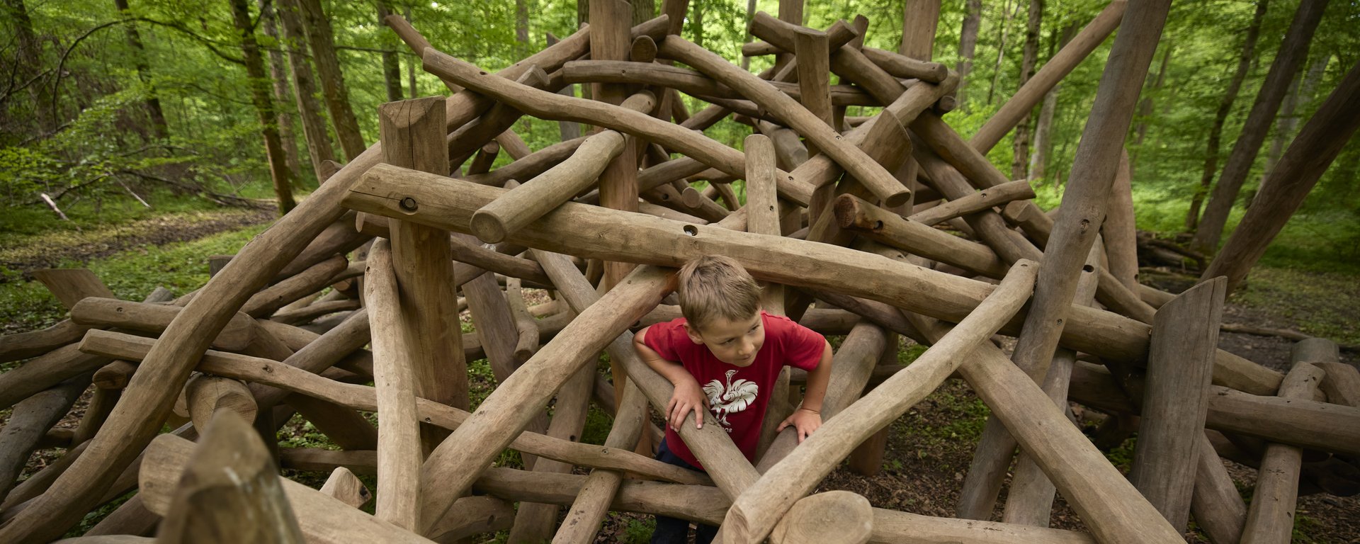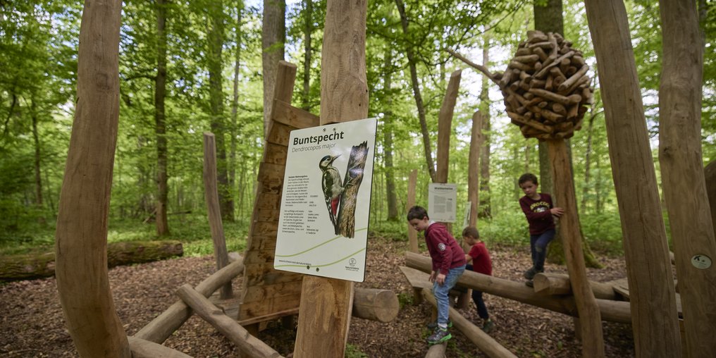 Erlebnisstationen im Wald, darunter ein Ameisenhügel, Hochsitz, Waldschaukel, eine märchenhafte Waldbehausung sowie Spiel- und Lernorte rund um Natur und Umwelt - Gut zu wissen