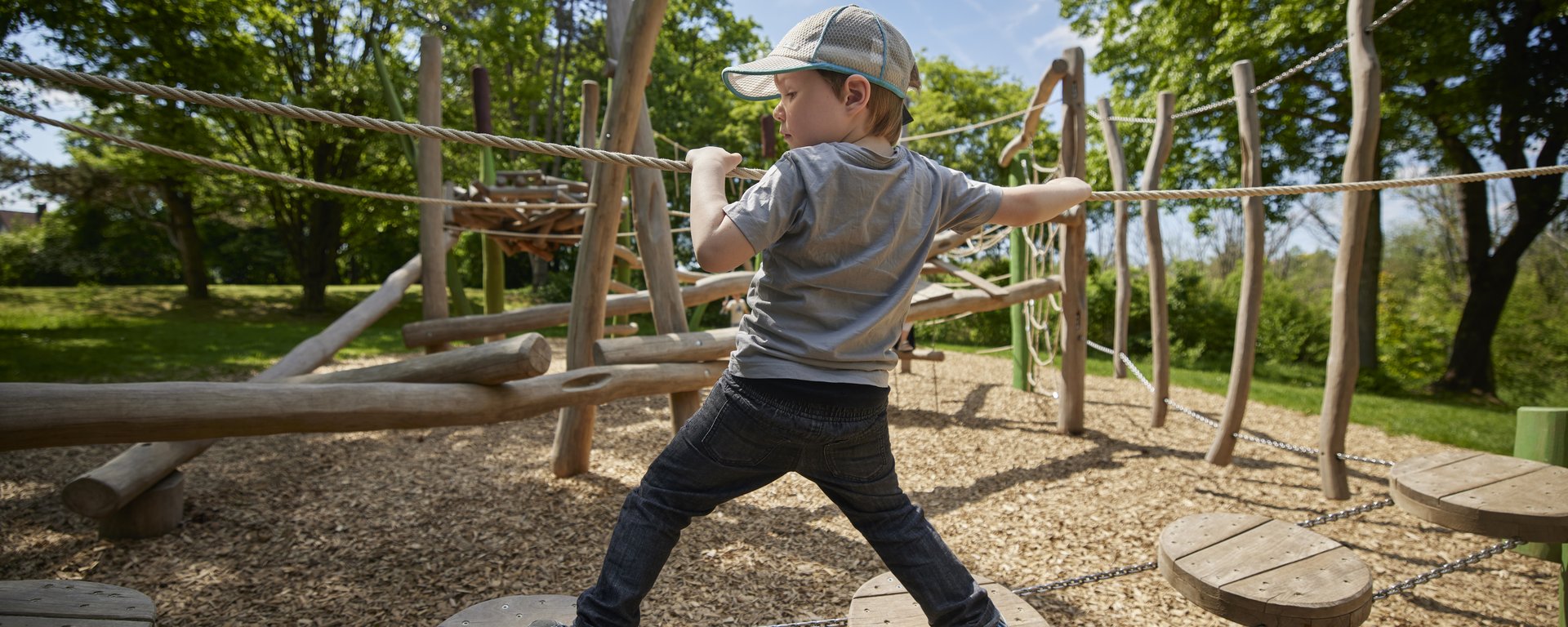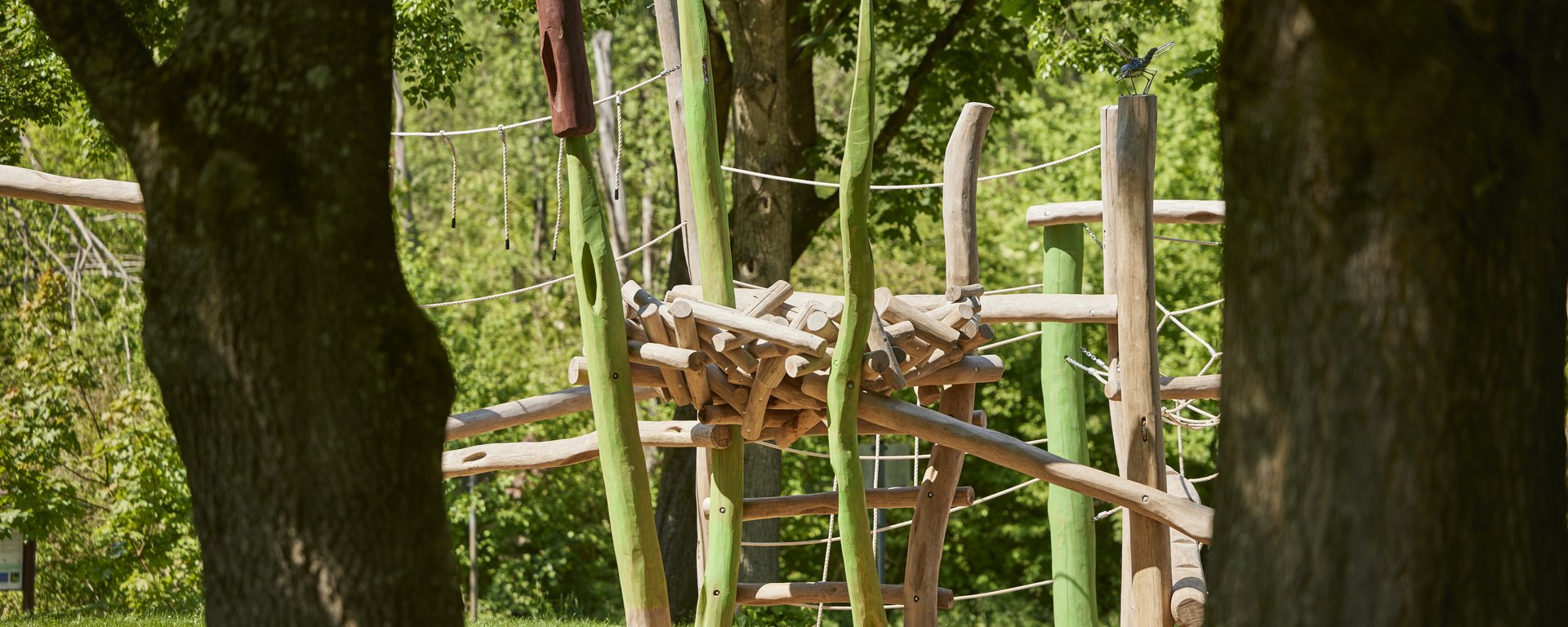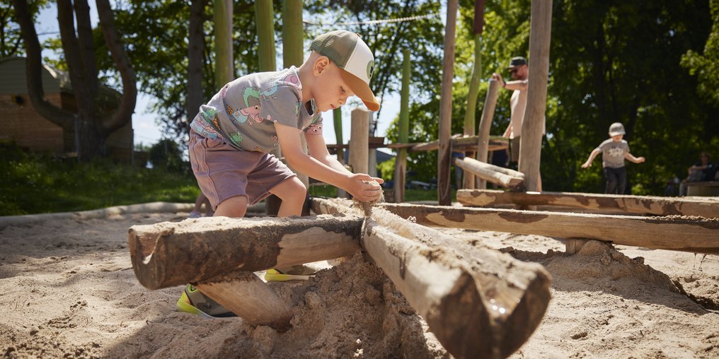 Naturerlebnisraum mit Bachlauf, kleinen Seen, Kletterwald aus Holzstämmen sowie Stegen und Plattformen zum Beobachten der Natur - Gut zu wissen