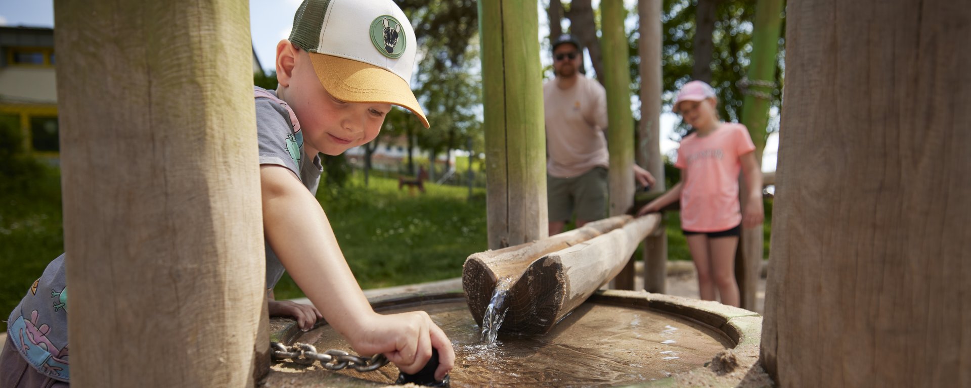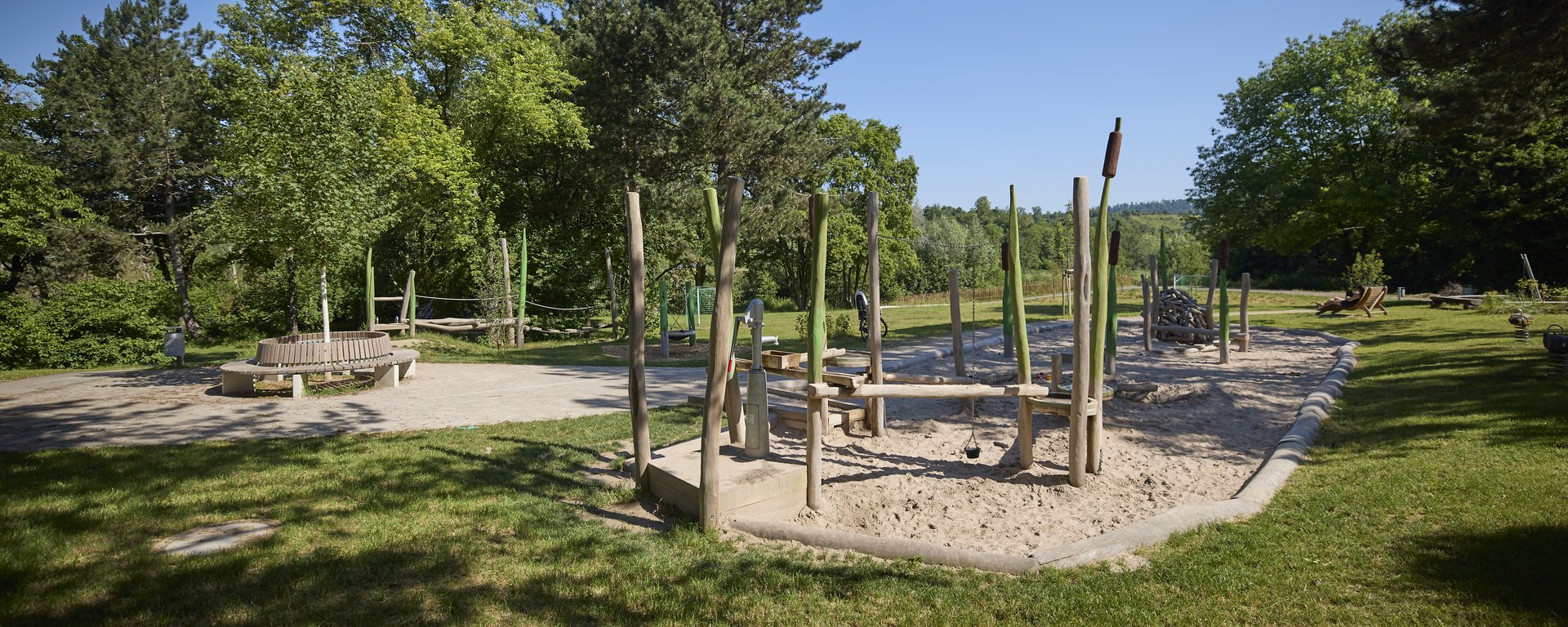 Natürliche Materialien wie Wasser, Erde, Holz und Pflanzen prägen die Anlage. Ein Bachlauf mit kleinen Seen, Stege und Holzplattformen, Spiel- und Kletterangebote sowie naturnahe Vegetationsflächen schaffen vielfältige Möglichkeiten zum Entdecken und Erforschen der Umgebung. Zusätzlich zu den Nassbereichen gibt es „Naschbereiche“ mit Wildfrüchten. Der Erlebnisraum verbindet Naherholung, Umweltbildung und ökologische Aufwertung und stärkt damit die Landschaft als Freizeit- und Lernort.